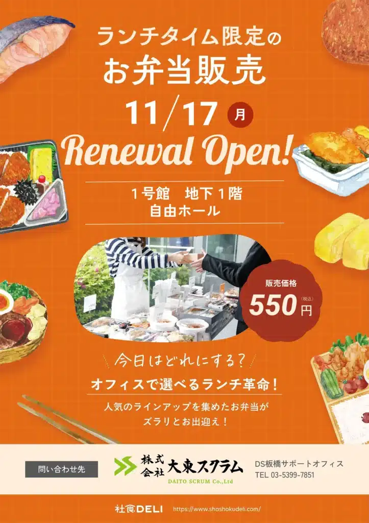 11月17日(月)より、板橋校舎1号館地下一階・自由ホールのランチタイム限定お弁当販売がリニューアルオープンします。