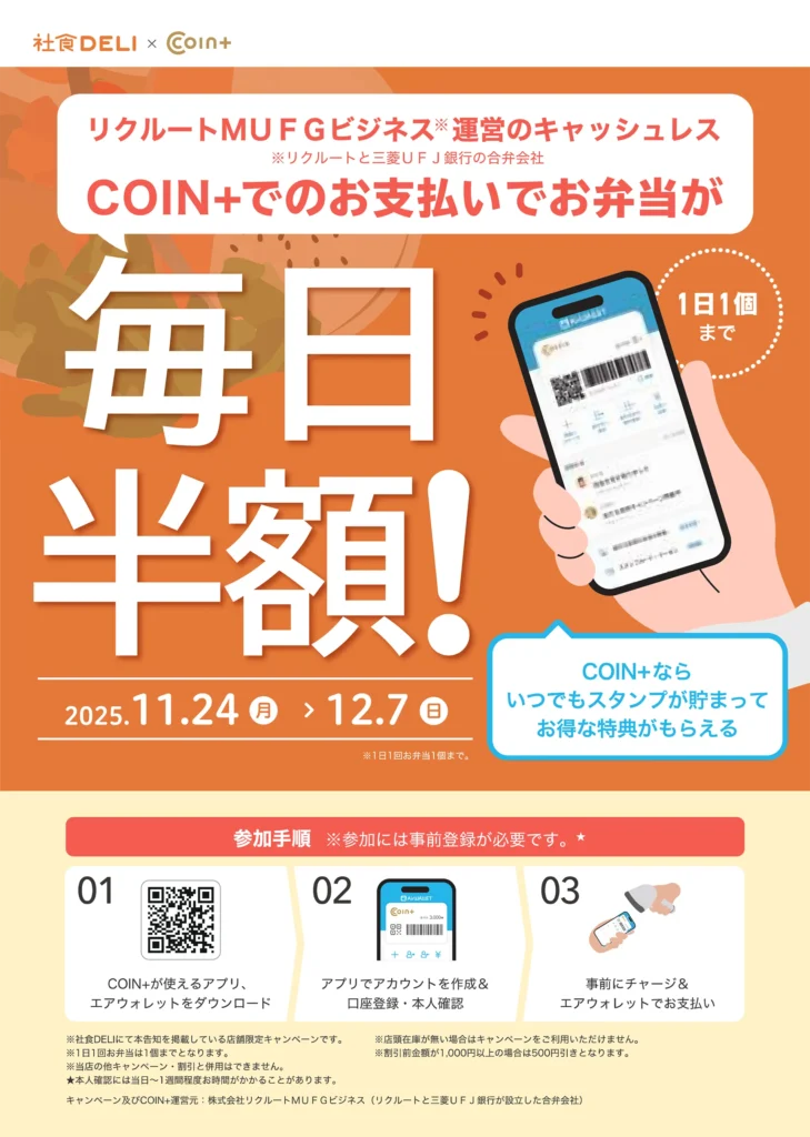 上記期間中、リクルートMUFGビジネス運営のキャッシュレス『COIN+』でお支払いいただくと、お弁当が毎日半額になるキャンペーンを実施いたします。