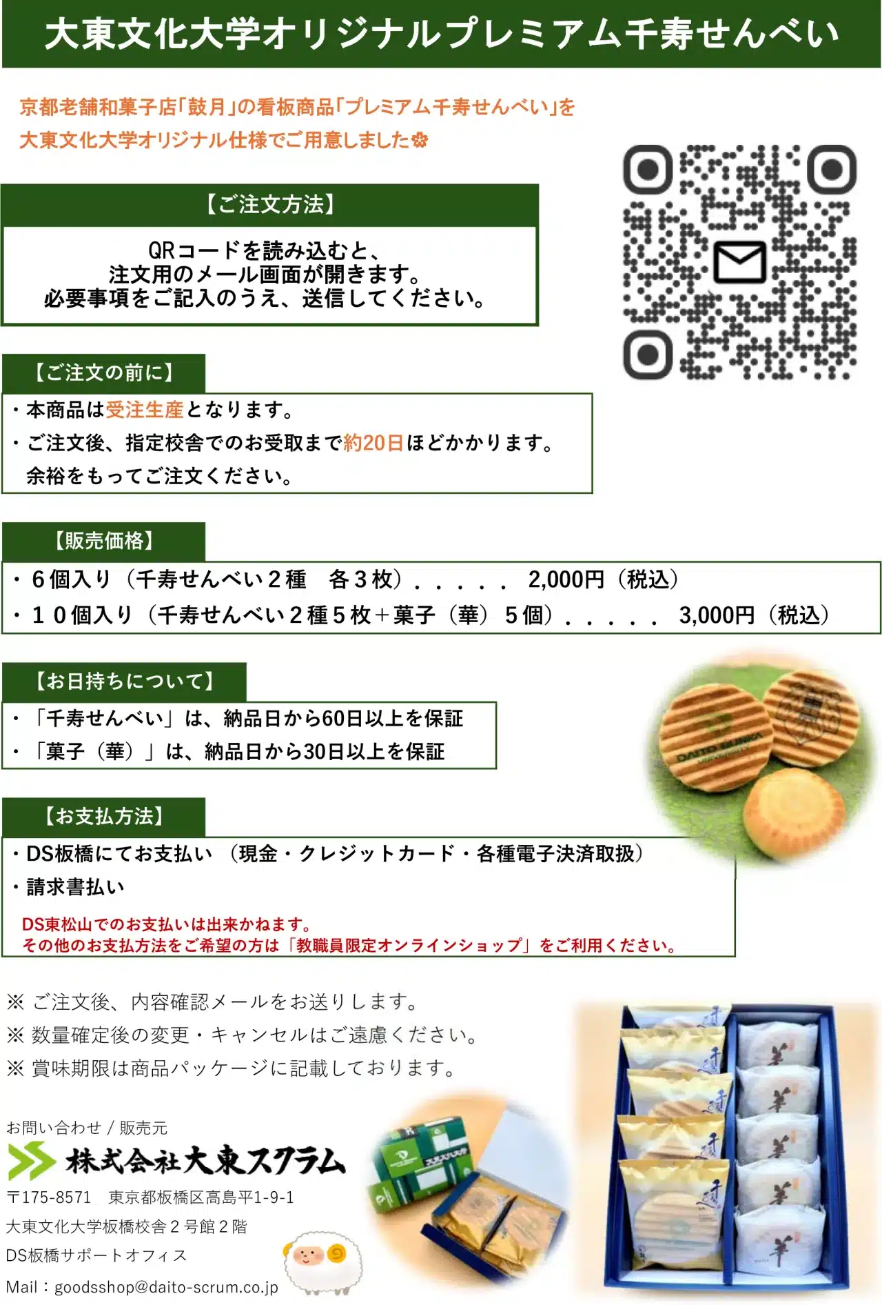 京都老舗和菓子店「鼓月」の看板商品「プレミアム千寿せんべい」を大東文化大学オリジナル仕様でご用意しました。 【ご注文方法】 以下チラシのQRコードを読み込むと、注文用のメール画面が開きます。必要事項をご記入のうえ、送信してください。
