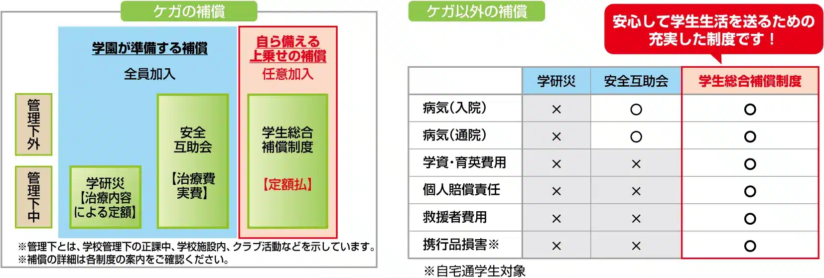 ご入学からご卒業まで、学校生活のみならず、日常生活全般におけるさまざまなケガ、扶養者の方に万一のことがあった場合の補償、損害賠償事故に対する補償などを総合的にご提供するものです。